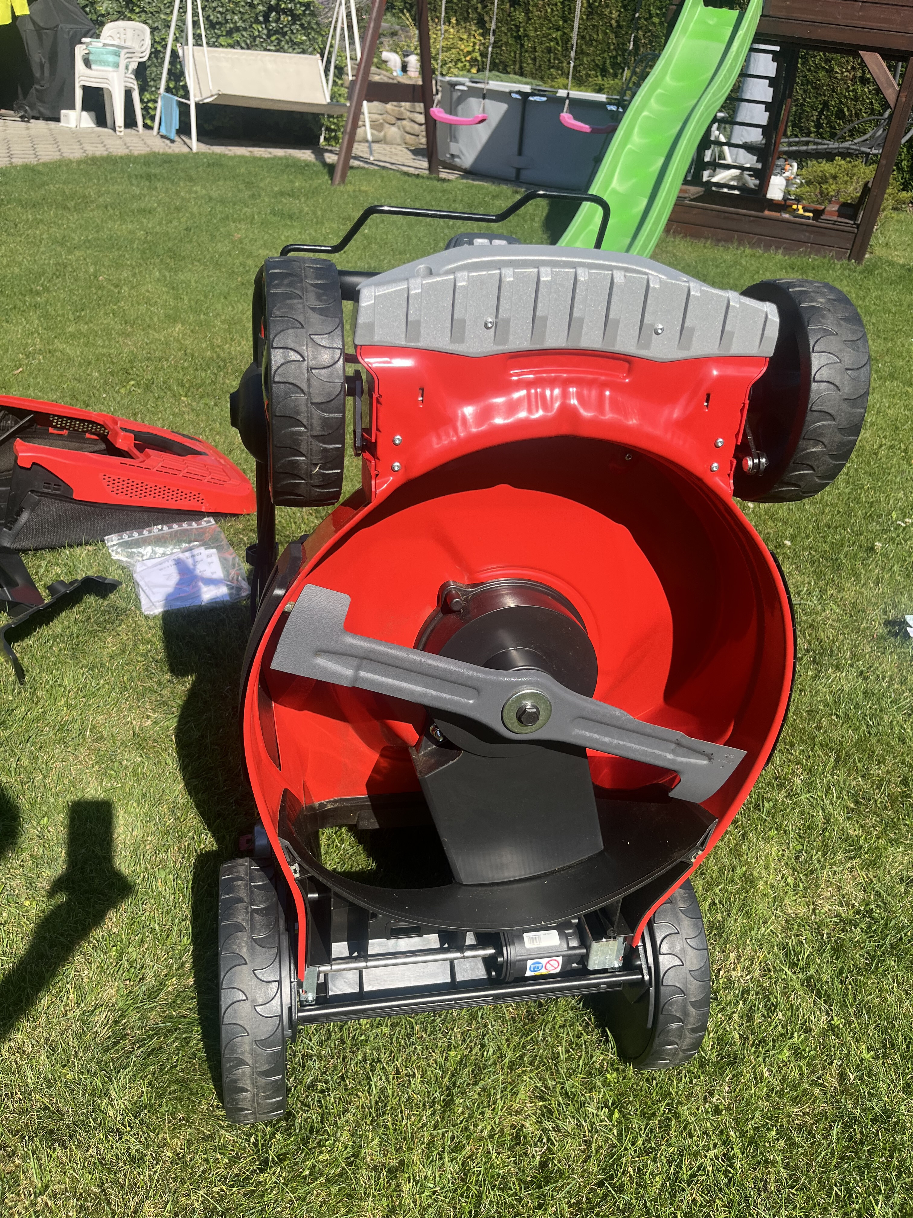 Na madle je kokpit, kde obsluha vidí stav nabití jednotlivých baterií, může si nastavit požadovanou rychlost pojezdu a zároveň vidí jakou rychlost má nastavenou, dále si může zapnout ECO režim pro prodloužení doby provozu (využijete na menší trávě při častějším sečení - sekačka si v ECO režimu sníží výkon a otáčky motoru). Sekačku lze rovněž spárovat s aplikací v mobilním telefonu, kde vidíte stav nabití akumulátoru, konektivitu, případně chybová hlášení.