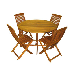 Luxusní masivní stolová sestava 4 skládacích židlí a skládacího stolu z exotického, velice trvanlivého a tvrdého dřeva akácie. Určeno do exteriérů, interiérů a pergolových prostor. Není vhodné pro používání ve vlhkém prostředí bez vhodné impregnace.