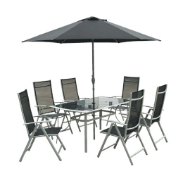 Luxusní stolová sestava 6-ti křesel a stolu z kombinovaných ocelo-hliníkových profilů určená do exteriérů a pergolových prostor. Křesílka jsou polohovatelná a skládací. Čalounění textiline. Stolová deska je z tvrzeného skla. Součástí sestavy je slunečník s kličkou.
